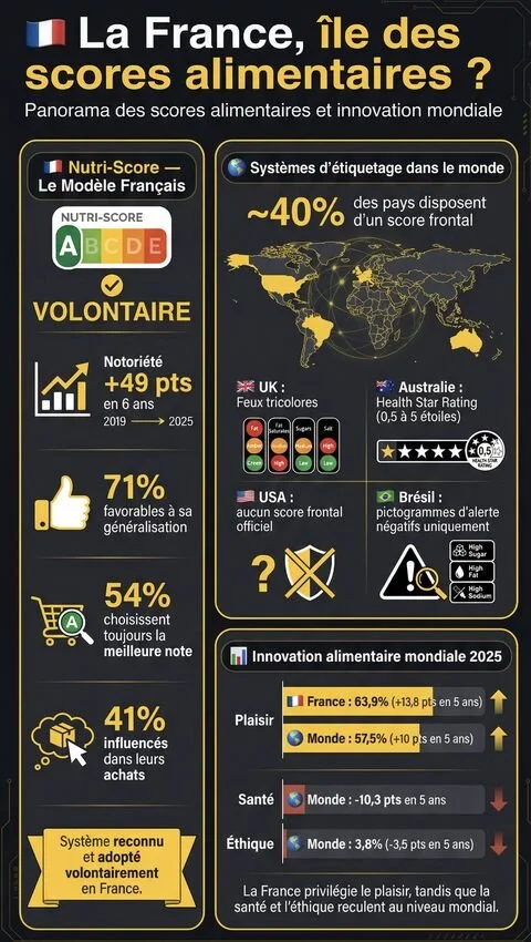Mais voilà le paradoxe : même en France, patrie des scores et de la gastronomie, l'innovation plaisir explose à +13,8 points en 5 ans — bien au-dessus de la moyenne mondiale.