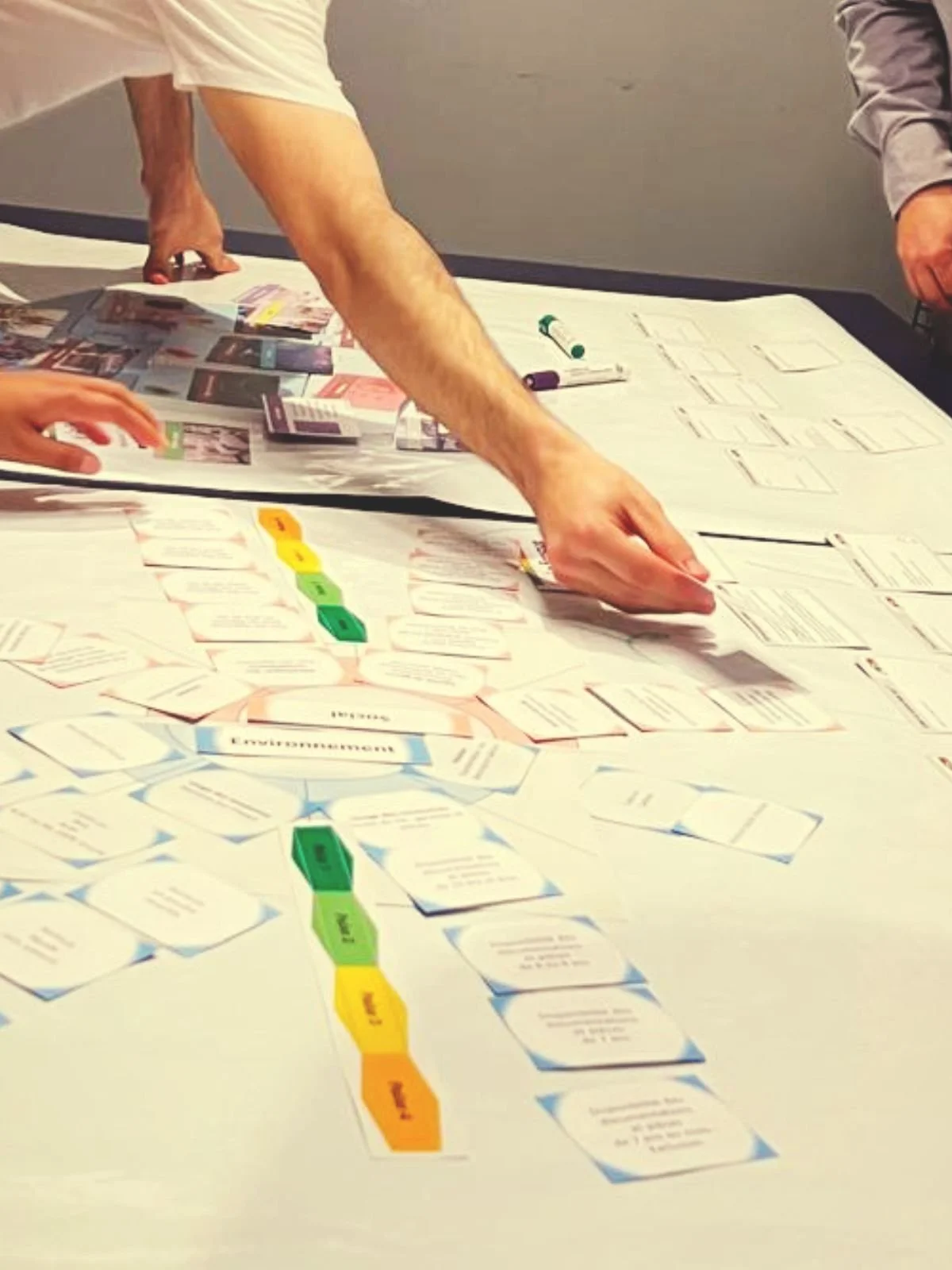 À l'image d'un jeu de l'oie, les participants reconstituent le processus théorique de construction d'un score en ordonnant 14 cartes d'étapes. L'objectif est d'appréhender ces phases et de commencer à les relier à la charte des scores.